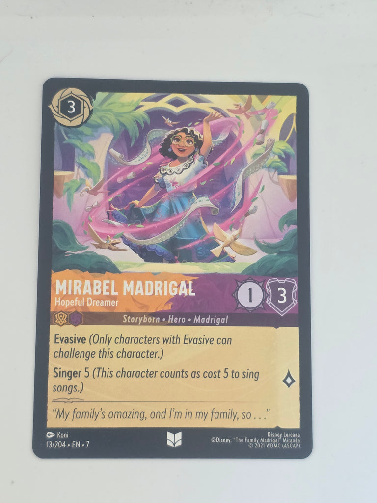 Bring heart, hope, and quiet strength to your deck with Mirabel Madrigal – Hopeful Dreamer, card #13 from the Disney Lorcana: Archazia’s Island base set. This Uncommon version of the central heroine from Disney’s Encanto shines with optimism, resilience, and the will to bring her family together — even without a magical gift.