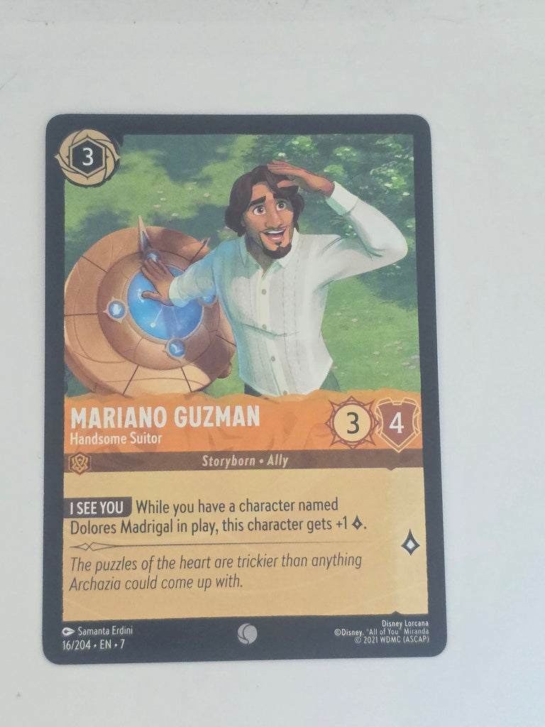 Step into the spotlight with Mariano Guzman – Handsome Suitor, card #16 from the Disney Lorcana: Archazia’s Island base set. This Common version of the poetic and passionate gentleman from Disney’s Encanto brings flair, charm, and surprising strength to your deck.