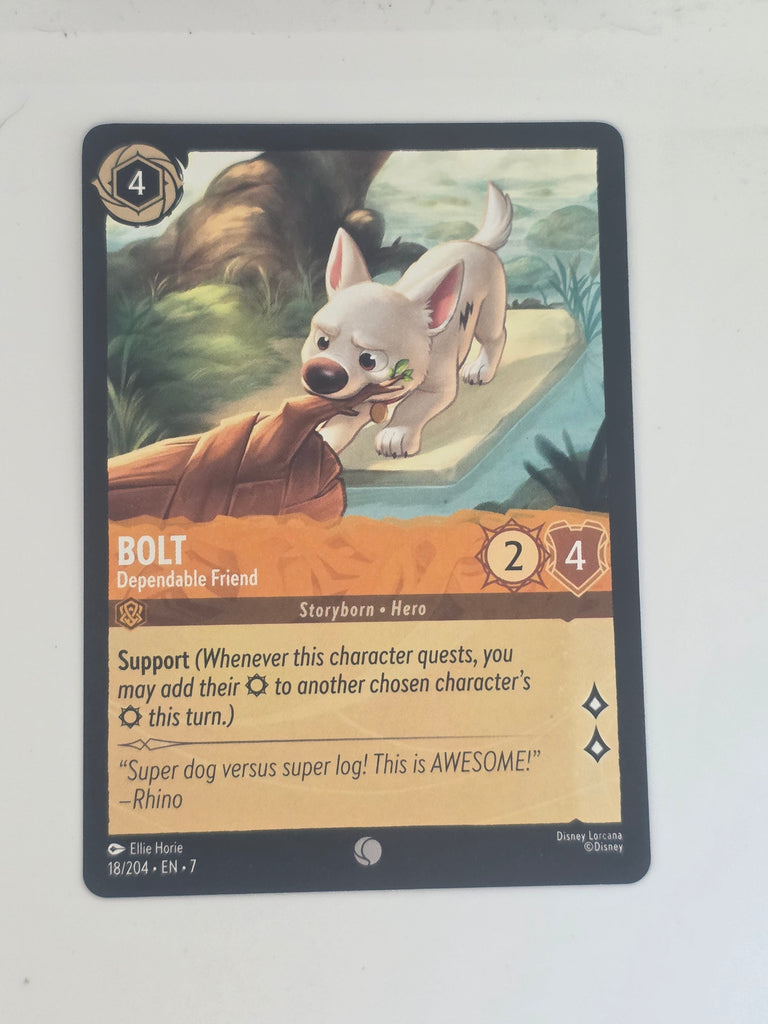 Dash into action with Bolt – Dependable Friend, card #18 from the Disney Lorcana: Archazia’s Island base set. This Common version of the heroic pup from Disney’s Bolt is full of heart, courage, and unshakable loyalty — the perfect teammate for any Illumineer looking to build a strong foundation.
