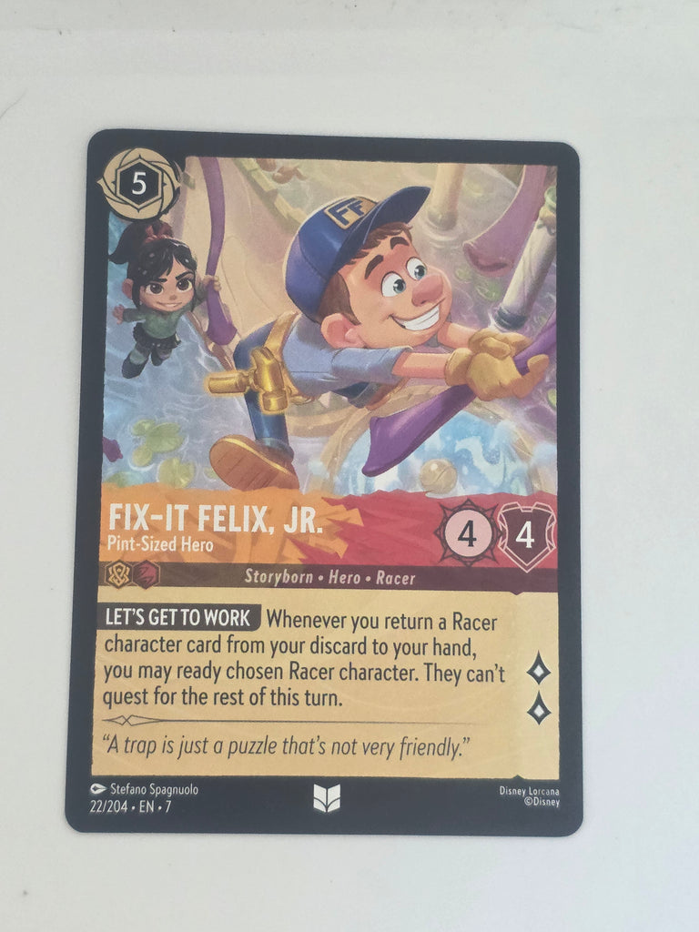 Bring cheerful charm and trusty tools to your deck with Fix-It Felix, Jr – Pint-Sized Hero, card #22 from the Disney Lorcana: Archazia’s Island base set. This Uncommon version of the lovable handyman from Disney’s Wreck-It Ralph may be small in stature, but he’s big on heart — and always ready to patch things up.