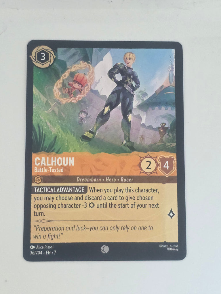 Bring military precision and fierce leadership to your deck with Calhoun – Battle-Tested, card #36 from the Disney Lorcana: Archazia’s Island base set. This Common card features the no-nonsense hero from Disney’s Wreck-It Ralph, ready for action with combat experience and tactical strength.