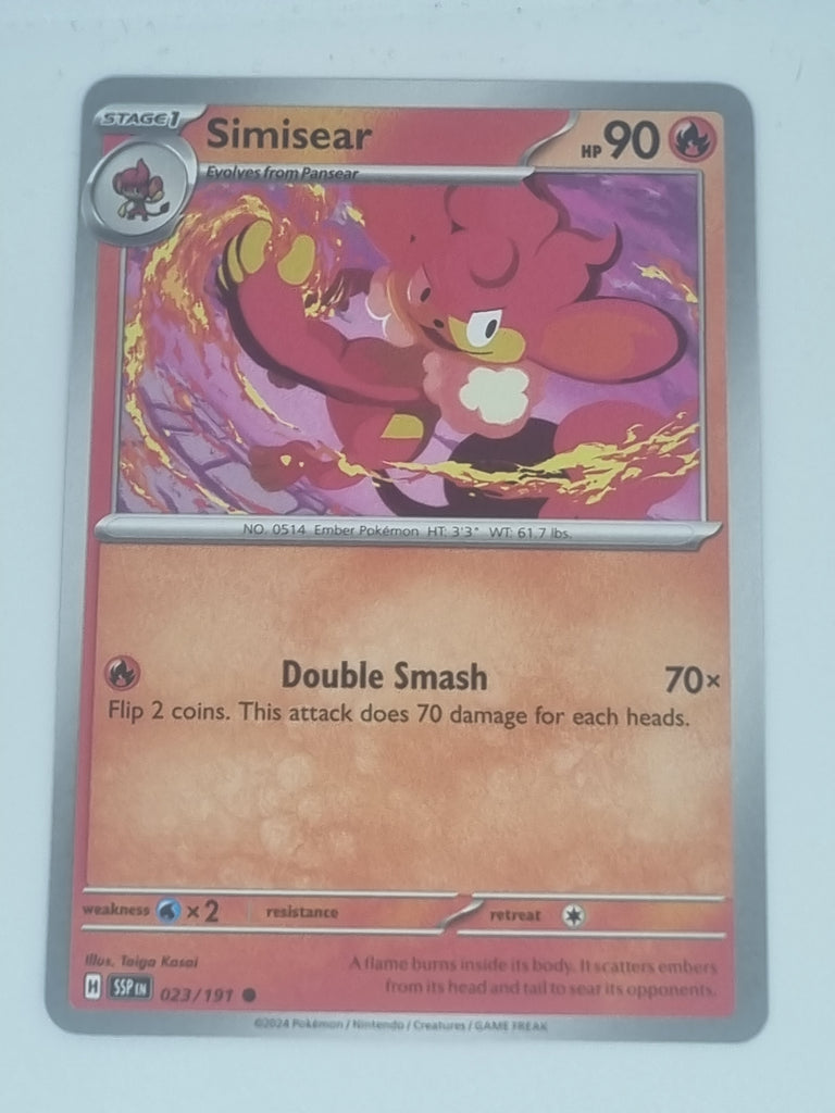 Bring the heat with Simisear from the Surging Sparks set! This Common card (#023/191) showcases the playful and fiery nature of this Fire-type Pokémon, making it a fun addition for trainers looking to enhance their collections. The vibrant artwork and intricate details capture Simisear's unique features and lively spirit, ensuring this card stands out in any collection.