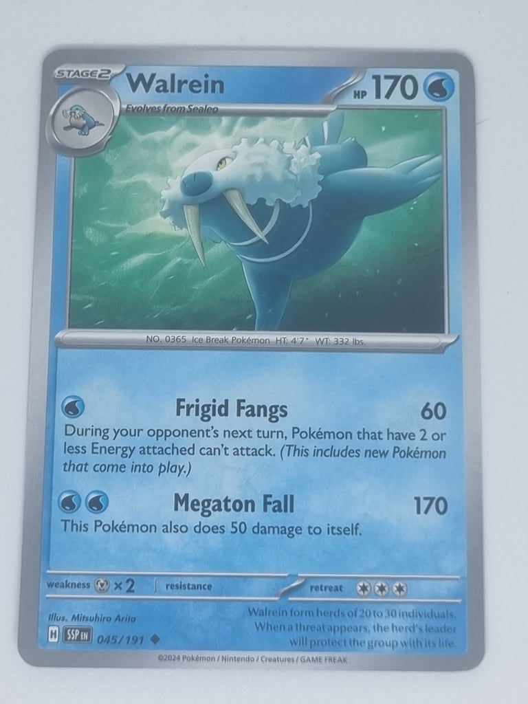 Harness the strength of Walrein from the Surging Sparks set! This Uncommon card (#045/191) showcases the powerful and imposing nature of this Ice/Water-type Pokémon, making it a fantastic addition for trainers looking to enhance their gameplay. The stunning artwork and intricate details highlight Walrein's unique features and majestic presence, ensuring this card stands out in any collection.