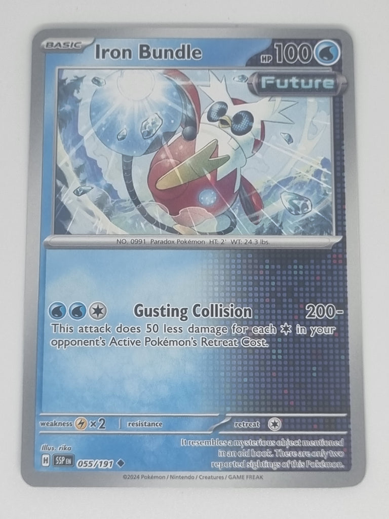 Discover the futuristic technology of Iron Bundle from the Surging Sparks set! This Uncommon card (#055/191) showcases the innovative and versatile nature of this Ice/Electric-type Pokémon, making it a fantastic addition for trainers looking to enhance their gameplay. The vibrant artwork and intricate details highlight Iron Bundle's unique design and mechanical features, ensuring this card stands out in any collection.