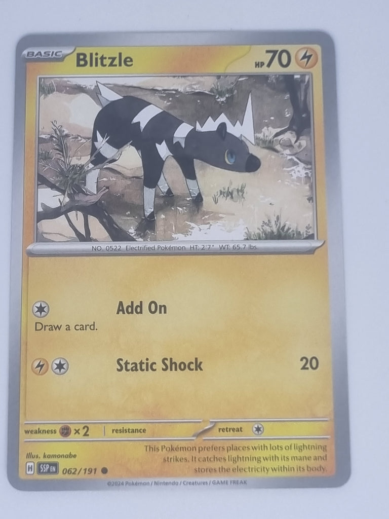 Feel the thrill of speed with Blitzle from the Surging Sparks set! This Common card (#062/191) showcases the energetic and lively nature of this Electric-type Pokémon, making it a fun addition for trainers looking to enhance their collections. The vibrant artwork and intricate details highlight Blitzle's unique features and spirited personality, ensuring this card stands out in any collection.