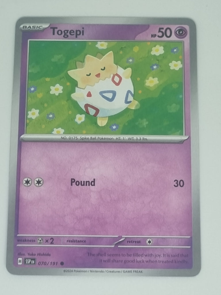Delight in the cuteness of Togepi from the Surging Sparks set! This Common card (#070/191) showcases the joyful and innocent nature of this Fairy-type Pokémon, making it a charming addition for trainers looking to enhance their collections. The vibrant artwork and intricate details highlight Togepi's adorable features, ensuring this card stands out in any collection.