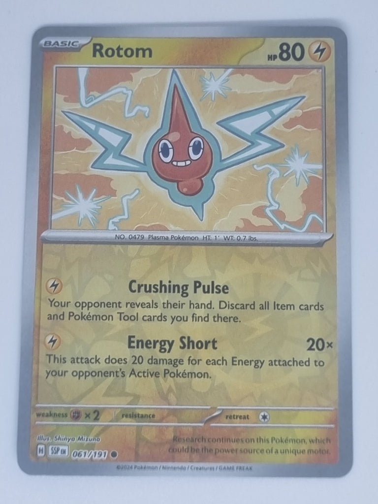 Add a spark of creativity to your deck with Rotom from the Surging Sparks set! This common Reverse Holo card (#061/191) showcases the versatility and playful nature of this Electric/Ghost-type Pokémon, making it a fun choice for trainers looking to enhance their strategies. Its shiny holo finish adds an eye-catching detail, perfect for both collectors and players alike.