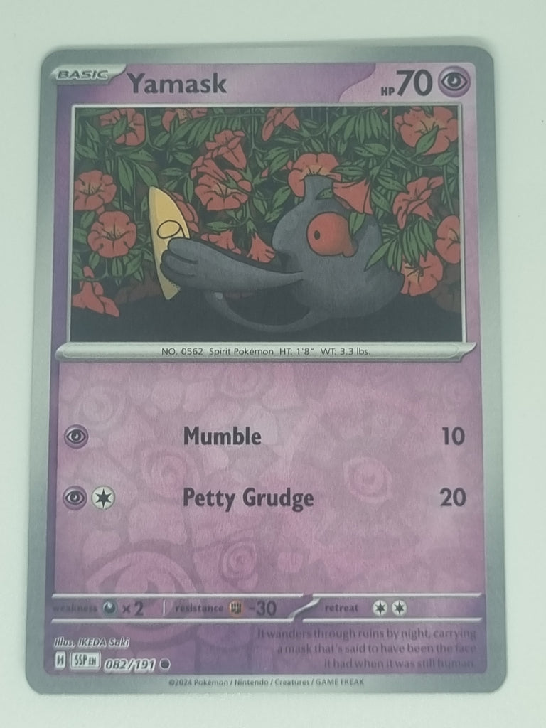 Embrace the spirit of the past with Yamask from the Surging Sparks set! This common Reverse Holo card (#082/191) captures the haunting charm of this Ghost-type Pokémon, making it a captivating addition for trainers and collectors alike. Its shiny holo finish adds an enchanting touch, perfect for showcasing in any collection.
