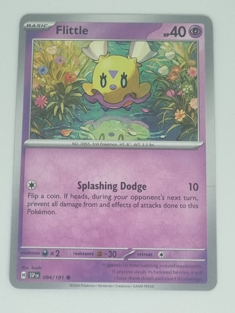 Delight in the charm of Flittle from the Surging Sparks set! This Common card (#094/191) showcases the cute and lively nature of this Psychic-type Pokémon, making it a delightful addition for trainers looking to enhance their collections. The vibrant artwork and intricate details capture Flittle's unique features, ensuring this card stands out in any collection.