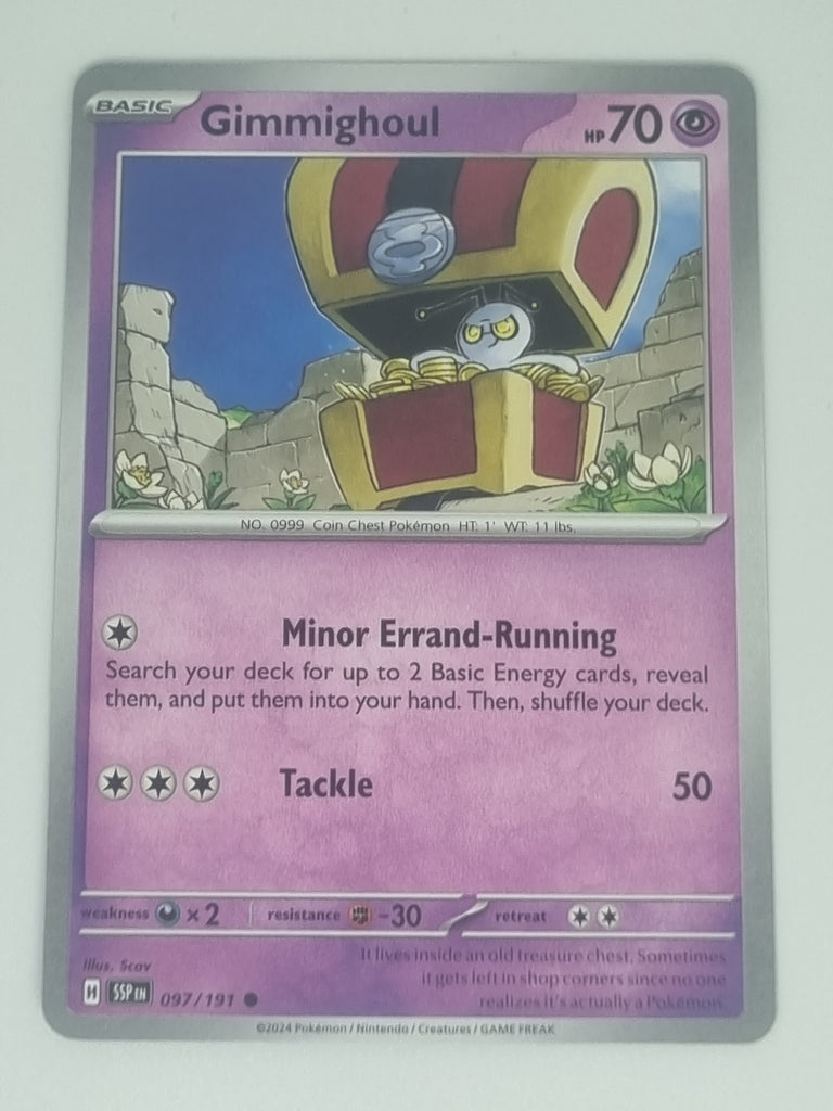 Discover the quirky charm of Gimmighoul from the Surging Sparks set! This Common card (#097/191) showcases the playful and treasure-loving nature of this Ghost-type Pokémon, making it a delightful addition for trainers looking to enhance their collections. The vibrant artwork and intricate details capture Gimmighoul's unique features, ensuring this card stands out in any collection.