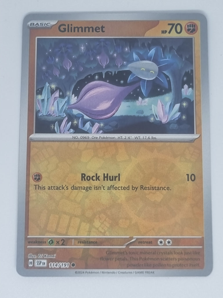 Add a touch of sparkle to your deck with Glimmet from the Surging Sparks set! This common Reverse Holo card (#114/191) brings a sense of elegance and charm, making it a delightful choice for trainers and collectors alike. Its radiant holo finish adds a captivating shimmer, perfect for any collection.