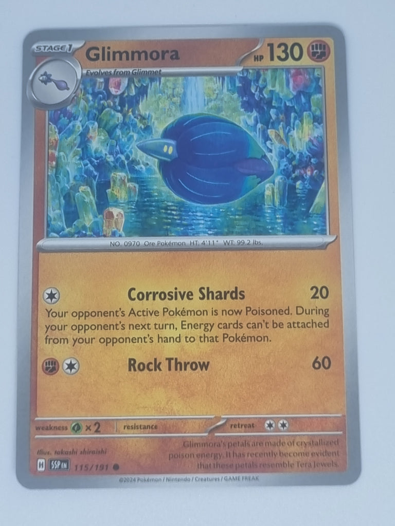 Illuminate your collection with Glimmora from the Surging Sparks set! This Common card (#115/191) showcases the unique and vibrant nature of this Rock/Poison-type Pokémon, making it a delightful addition for trainers looking to enhance their gameplay. The stunning artwork and intricate details highlight Glimmora's distinct features, ensuring this card stands out in any collection.