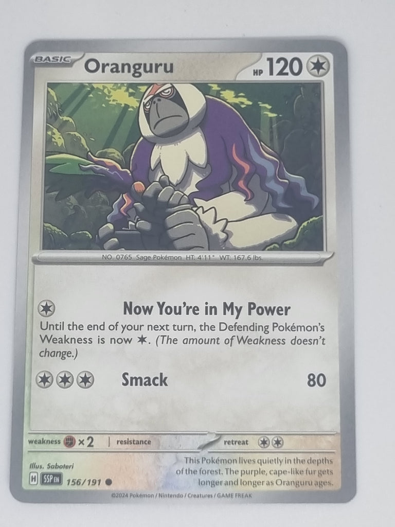 Discover the wisdom of Oranguru from the Surging Sparks set! This Common card (#156/191) showcases the thoughtful nature of this Normal-type Pokémon, making it a unique addition for trainers looking to enhance their gameplay. The vibrant artwork and intricate details highlight Oranguru's characteristics, ensuring this card stands out in any collection.