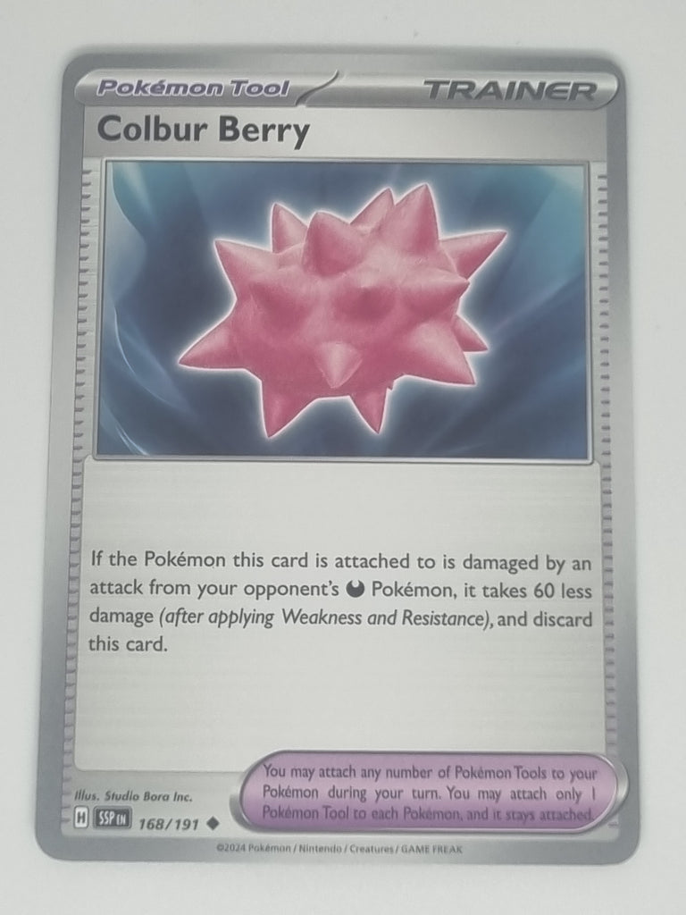 Boost your Pokémon's resilience with Colbur Berry from the Surging Sparks set! This Uncommon card (#168/191) provides vital protection against damage, making it a valuable addition for trainers looking to enhance their strategies. The vibrant artwork and detailed design highlight the berry’s unique properties, ensuring it stands out in any collection.