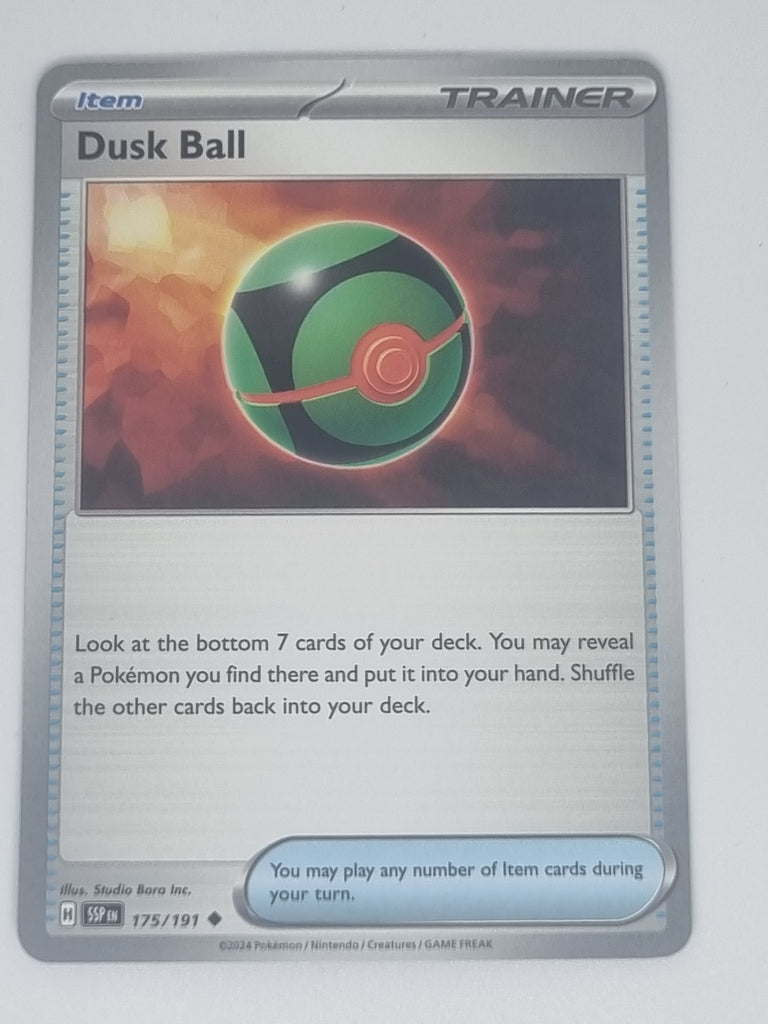 Enhance your capture strategies with Dusk Ball from the Surging Sparks set! This Uncommon card (#175/191) allows you to search your deck for a Pokémon, particularly effective when it’s nighttime or in darker conditions, making it a valuable addition for trainers looking to strengthen their decks. The vibrant artwork and intricate design highlight the unique attributes of this item, ensuring it stands out in any collection.