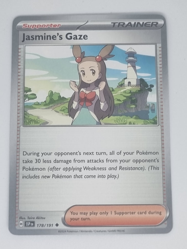 Discover the insightful nature of Jasmine's Gaze from the Surging Sparks set! This Uncommon card (#178/191) beautifully captures Jasmine’s thoughtful demeanor and her connection with Pokémon. The vibrant artwork and intricate details make this card a valuable addition for trainers looking to enhance their strategies in battle.