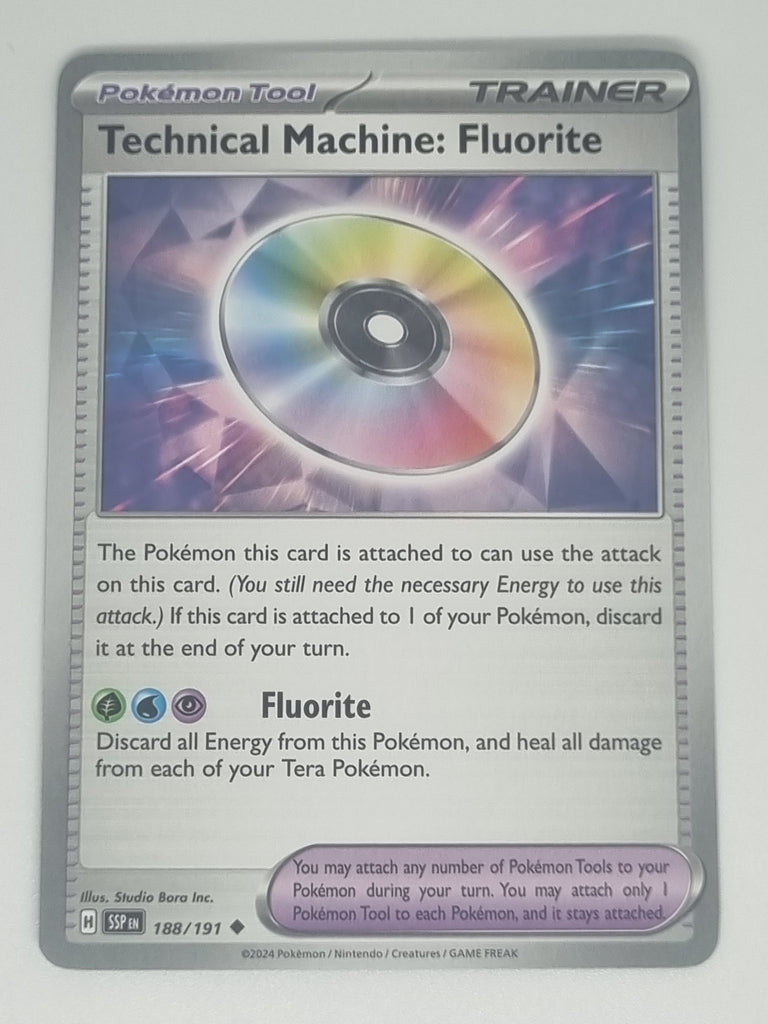 Enhance your Pokémon's moves with the Technical Machine: Fluorite from the Surging Sparks set! This Uncommon card (#188/191) allows you to teach your Pokémon powerful new techniques, adding versatility to your battle strategies. The vibrant artwork and detailed design showcase the essence of this Technical Machine, making it a valuable addition for trainers looking to elevate their gameplay.