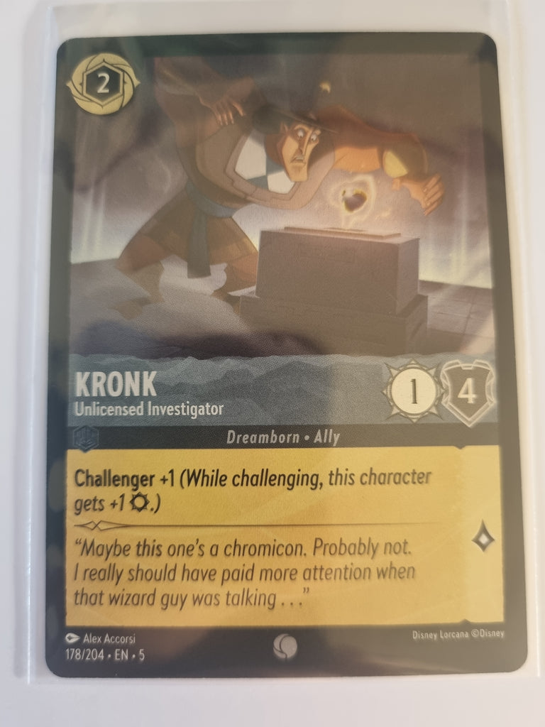 The Kronk - Unlicensed Investigator card captures the humorous and determined nature of Kronk as he takes on the role of an unlicensed investigator. With its vibrant and detailed artwork, this card brings the delightful charm of this beloved Disney character to life. As a FOIL parallel of the base card, it features a special finish that makes it even more captivating.