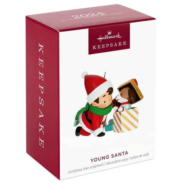 Ever wondered what Santa Claus was like as a child? This adorable Young Santa Christmas tree ornament gives you a glimpse into Santa’s early years, filled with playful moments and joyful surprises. The 3rd in the Young Santa Keepsake Ornament series, this year's design features little Santa discovering his puppy as it jumps out of a gift box, capturing the magic and wonder of childhood holiday memories. With exceptional artistry and heartwarming detail, this ornament is sure to bring smiles and festive cheer to your tree.